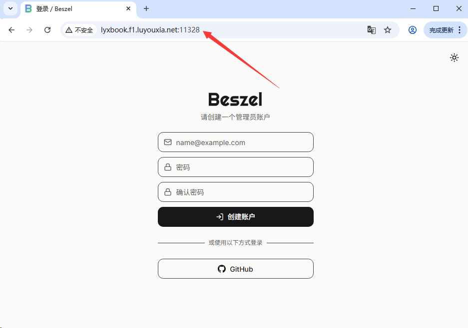 12,在外网电脑上,打开浏览器,在地址栏输入从路由侠生成的外网地址,就可以看到内网部署的 Beszel 登录界面了。