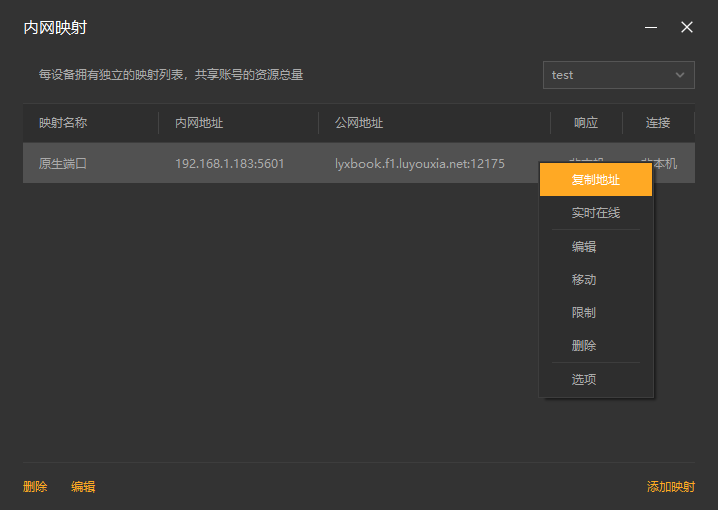 11,创建好后,就可以看到一条映射的公网地址,鼠标右键点击【复制地址】。