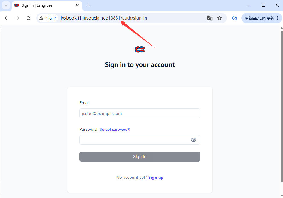 12,在外网电脑上,打开浏览器,在地址栏输入从路由侠生成的外网地址,就可以看到内网部署的 Langfuse 登录界面了。