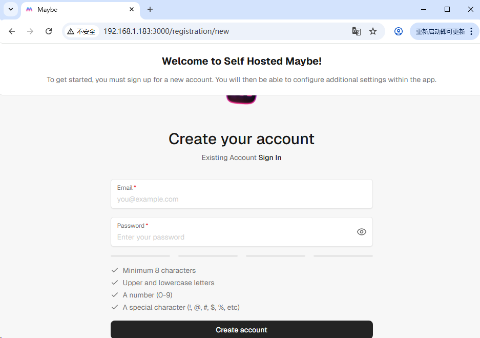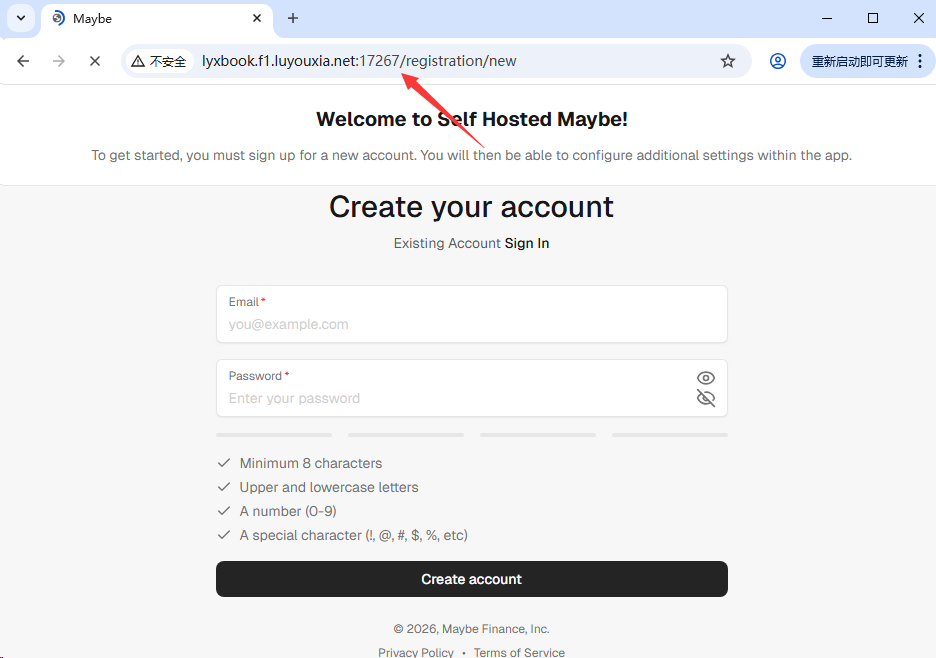 12,在外网电脑上,打开浏览器,在地址栏输入从路由侠生成的外网地址,就可以看到内网部署的 Maybe 界面了。