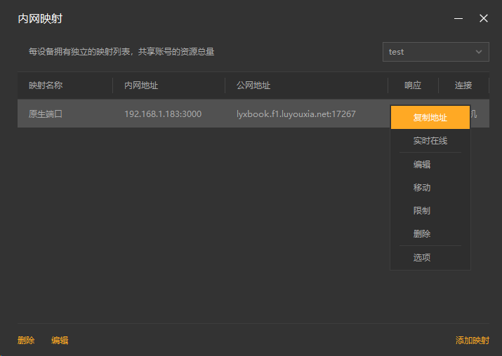 11,创建好后,就可以看到一条映射的公网地址,鼠标右键点击【复制地址】。