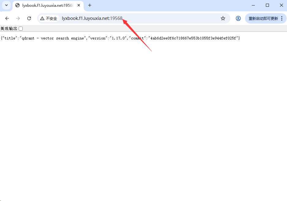 12,在外网电脑上,打开浏览器,在地址栏输入从路由侠生成的外网地址,就可以看到内网部署的 Qdrant 返回的 JSON 文件了。