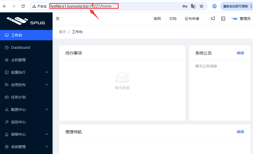 11,在外网电脑上,打开浏览器,在地址栏输入从路由侠生成的外网地址,就可以看到内网部署的 Spug 登录界面了。