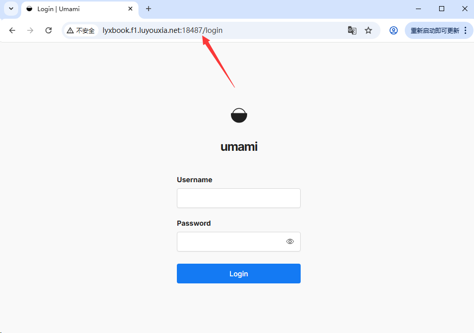 12,在外网电脑上,打开浏览器,在地址栏输入从路由侠生成的外网地址,就可以看到内网部署的 Umami 登录界面了。