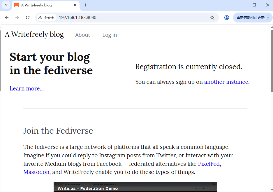 9,打开浏览器访问地址 http://你的服务器 IP:8080 ,就能看到你部署的 WriteFreely 界面了。