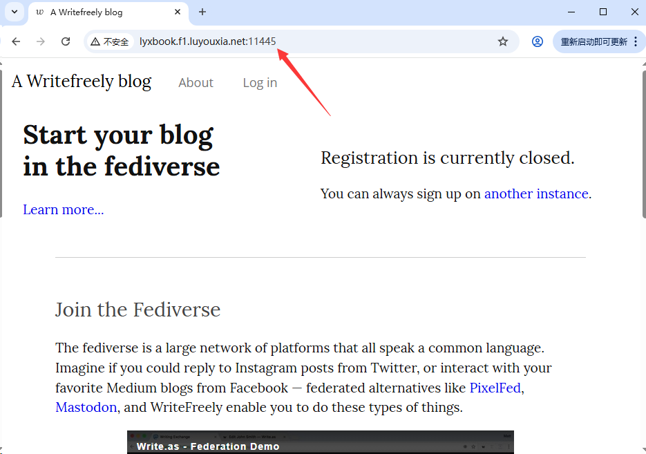 12,在外网电脑上,打开浏览器,在地址栏输入从路由侠生成的外网地址,就可以看到内网部署的 WriteFreely 界面了。